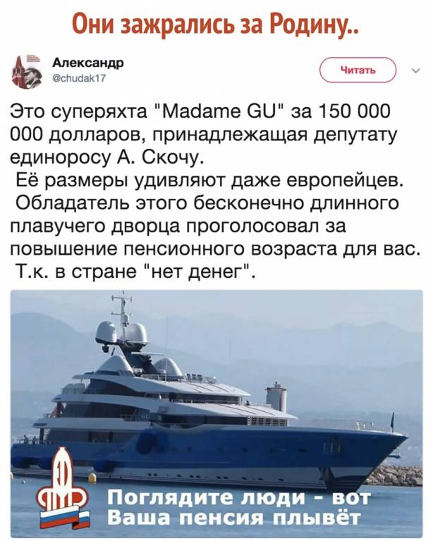 Меня моё рабочее местоположение хотя бы временно спасёт от сего апокалипсиса. Поясняю: отгородится стреляющими дронами Московия от остальных сограждан, которые проявят крайнюю степень недовольства на неофициальное предложение медленно и планомерно сдыхать где-то там у себя.Бальдр: 27 июл 2018, 16:02 Пока ее не отстранят. И пенсией дело не ограничится-ползарплаты займами да облигациями получить-кто то хочет? А придется.