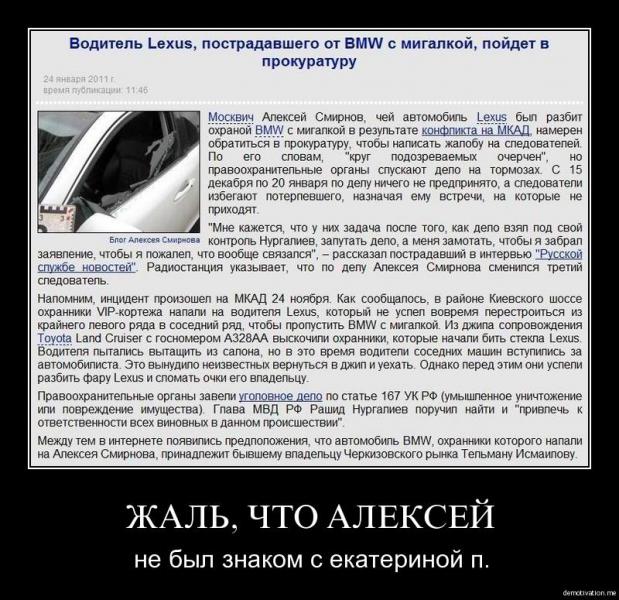 По ТВ проскакивала инфа, что охранники - это Ингуши, личка Евкурова. А после покушения на него, он ходит в фаворе у Путина и Медведева. Поэтому , так как у нас "правовое" государство, водителю Lexusa не чего не светит. Хотя конечно можно было бы и замять это дело по человечески.