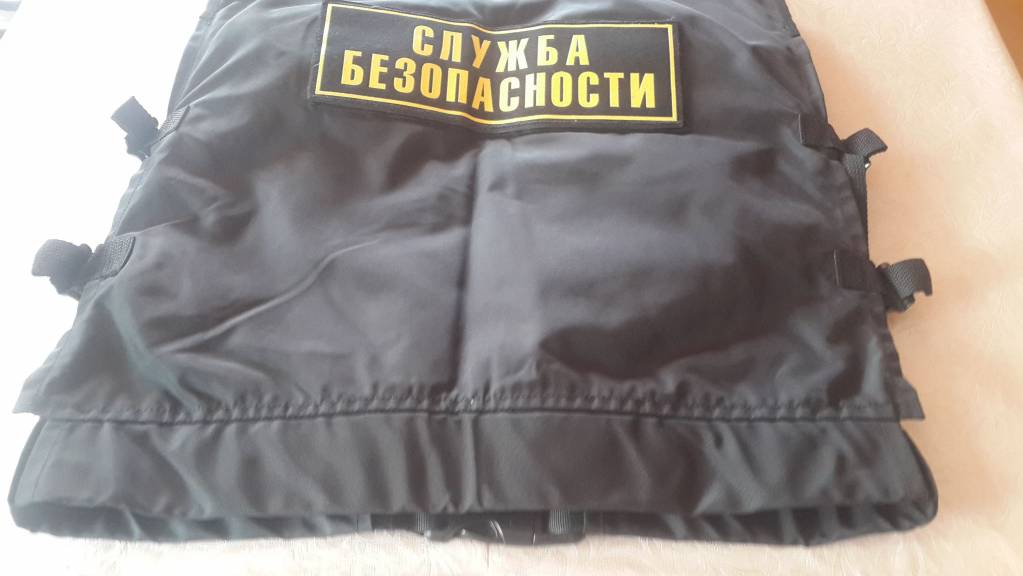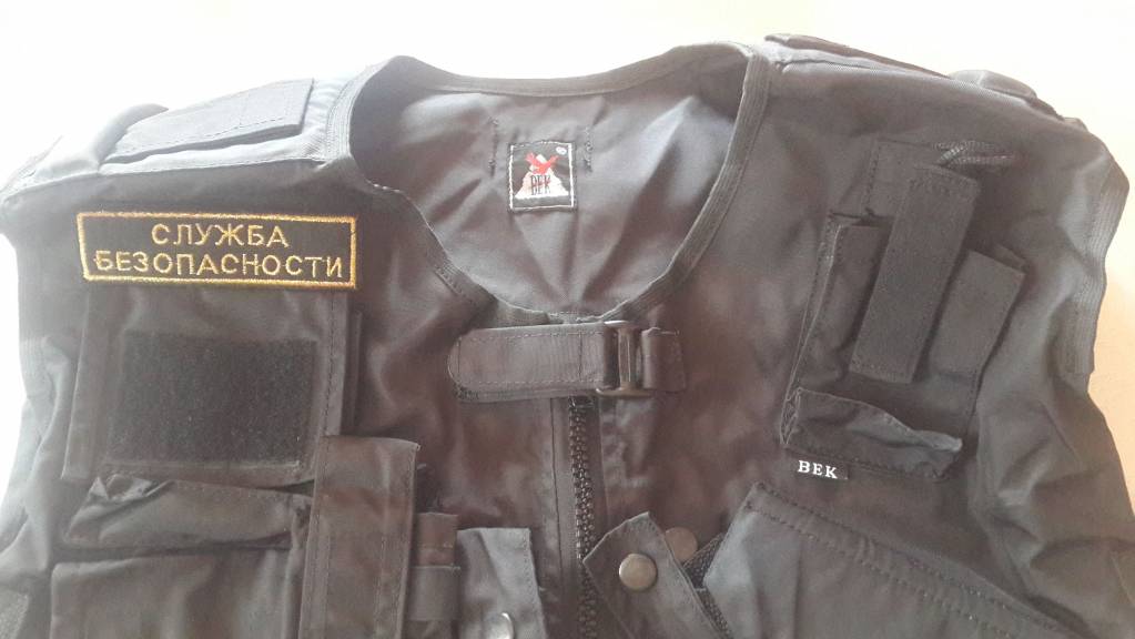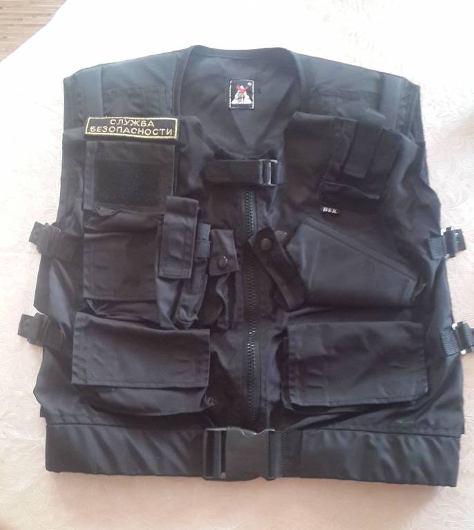 На жилете имеется кобура под пистолет Макарова, карманы для документов, ключей, радиостанции, запасной обоймы, газового баллончика и печати. Дополнительно в ателье пришито велкро для крепления нашивок и патчей. Размер 48-60 (регулируется боковыми лямками).