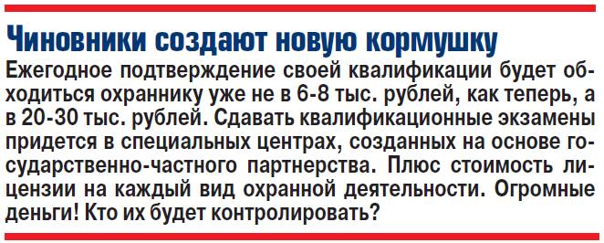 Что изменится? В частности, то, что ежегодное подтверждение своей квалификации будет обходиться охраннику уже не в 6-8 тыс. рублей, как теперь, а в 20-30 тыс. рублей, такие приблизительные оценки дают в Национальной ассоциации телохранителей.