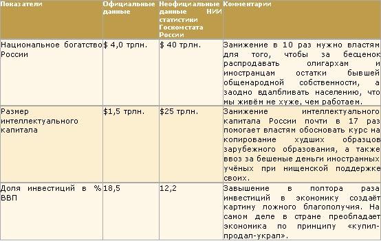 Национальное богатство России. Официально: $4,0 трлн. Фактически (по данным НИИ статистики Госкомстата России): $40 трлн. Занижение в 10 раз, комментирует Смолин, нужно властям для того, чтобы за бесценок распродавать олигархам и иностранцам остатки бывшей общенародной собственности, а заодно вдалбливать населению, что мы живем не хуже, чем работаем.
