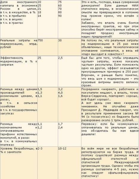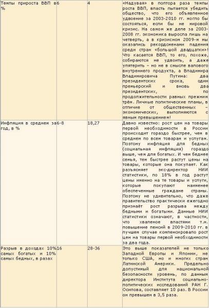 Темпы прироста ВВП. Официально: 6%. Фактически: 4%. «Надувая» в полтора раза темпы роста ВВП, власть пытается убедить общество, что его объявленное удвоение за 2003-2010 гг. могло бы состояться, если бы не мировой кризис. На самом же деле, отмечает Смолин, за 2003-2008 гг. экономика выросла лишь на четверть, а в кризисном 2009-м мы оказались рекордсменами падения среди стран «Большой двадцатки»! Что касается ВВП, то его, саркастично замечает депутат, похоже, собираются не удвоить, а даже упятерить, но не в смысле валового внутреннего продукта, а Владимира Владимировича Путина: два президентских срока, один премьерский и вновь два президентских, по продолжительности равных прежним трем.